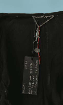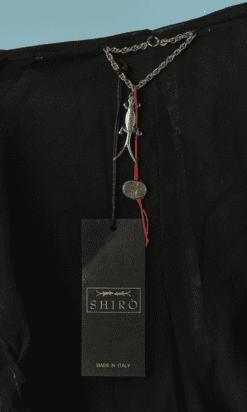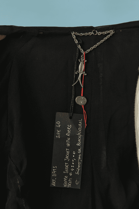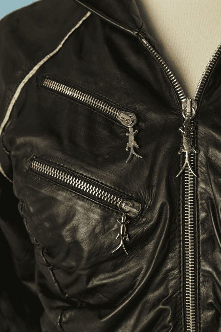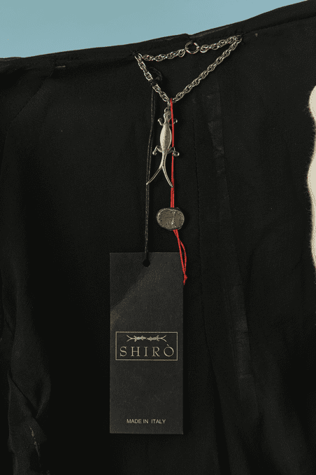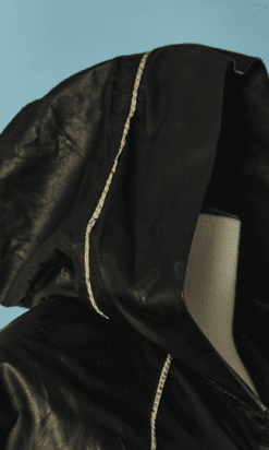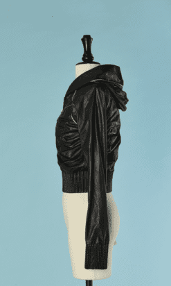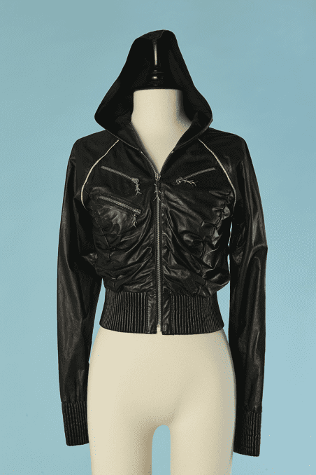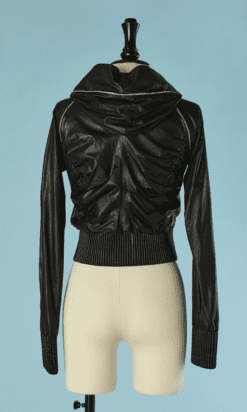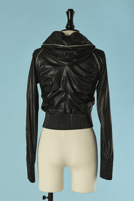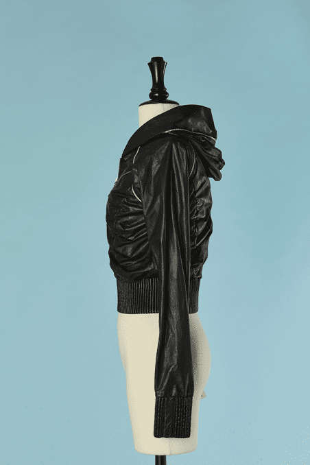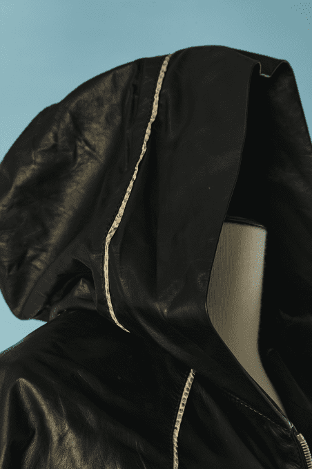 Blouson Shiro en agneau noir et liseré en serpent, manches longues, capuche, double fermeture éclair poitrine, fronces sur les côtés, bords côtes taille et poignets élastiques, crocodile en métal argenté Taille 34