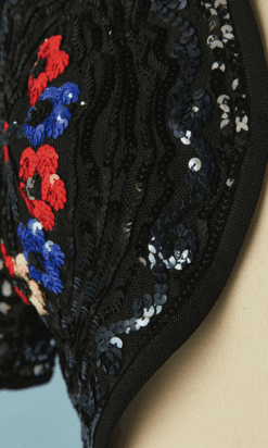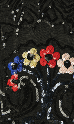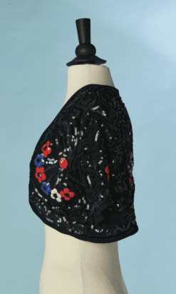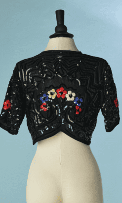 Boléro Sonia Rykiel en tulle noir brodé de paillettes noires et fleurs en paillettes bleues rouges roses et vert pâle, manches courtes, sans fermeture, étiquette blanche et noire taille 38