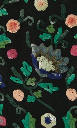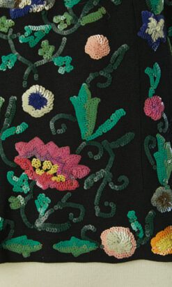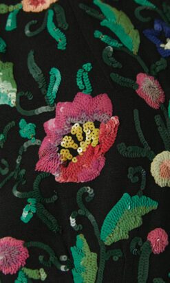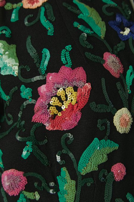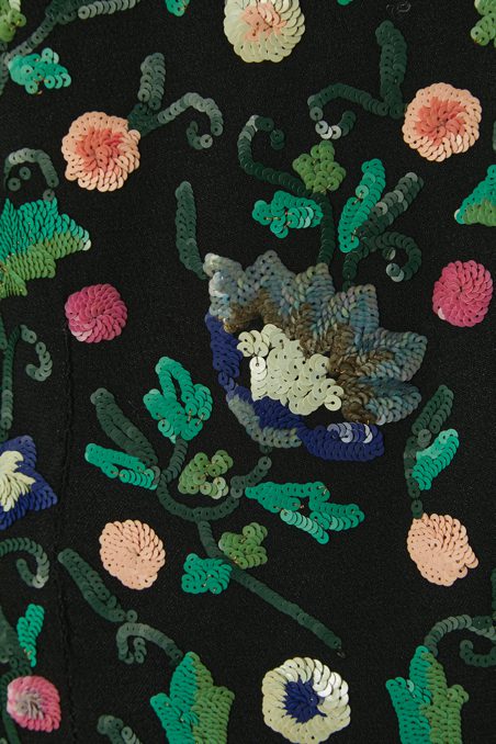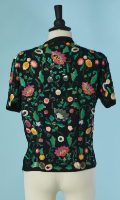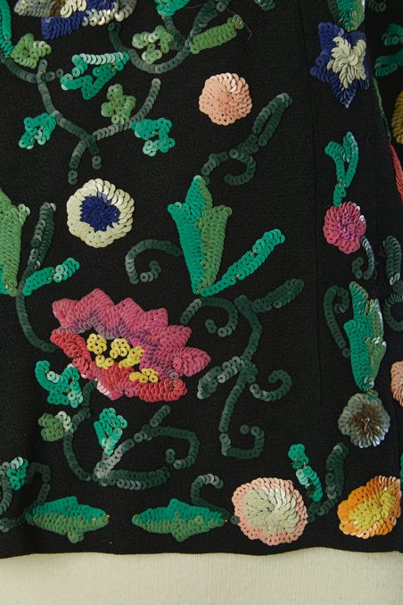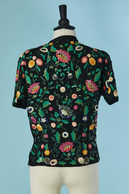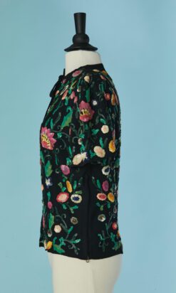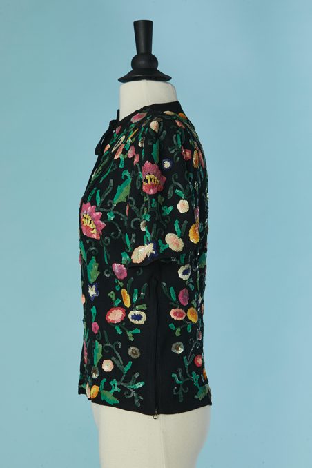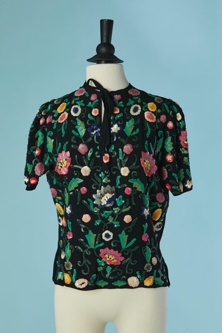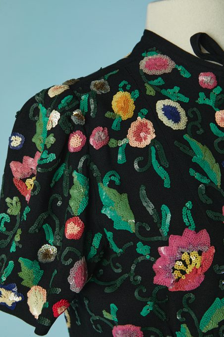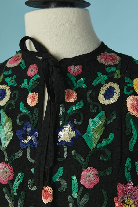Chemisier 1930 en crêpe noir brodée de motifs de fleurs et feuillages pailletés multicolores, manches courtes, encolure ras de cou avec un lien noué, fermeture éclair sur le côté