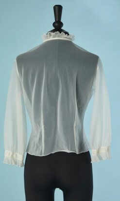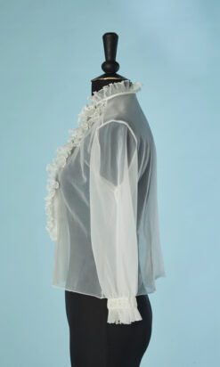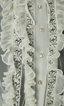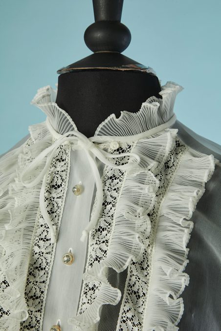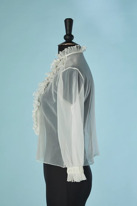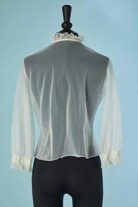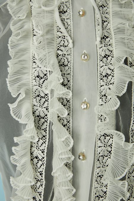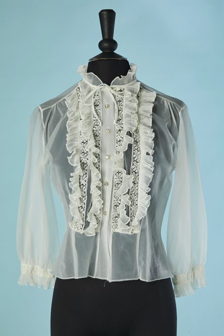 Chemisier 1950 en voile de nylon blanc, manches longues avec poignets plissés, large plastron avec entre-deux de dentelle et volants plissés, petits boutons boules nacrés, col plissé