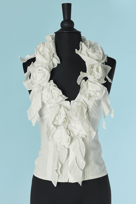 Chemisier corseté vintage Anne Fontaine en coton, avec fleurs et feuillages en relief blanc, emmanchures américaines, se ferme devant par des agrafes, étiquette blanche et noire, T36