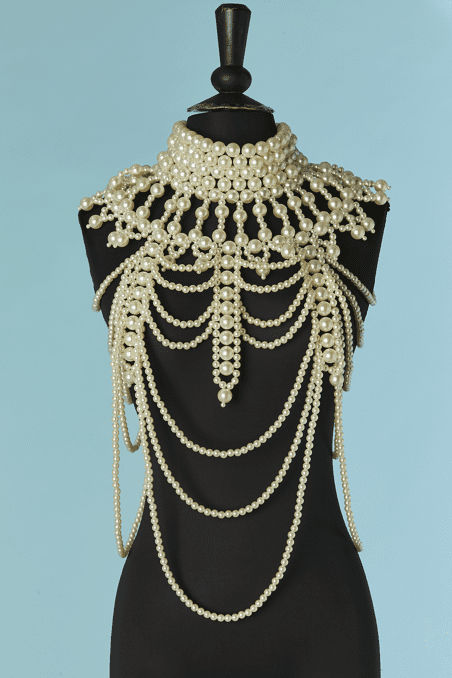 Collier plastron en perles nacrées blanches, 5 rangées de perles montantes, plastron composé de différentes tailles de perles retombant sur la poitrine et les épaules
