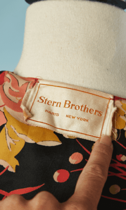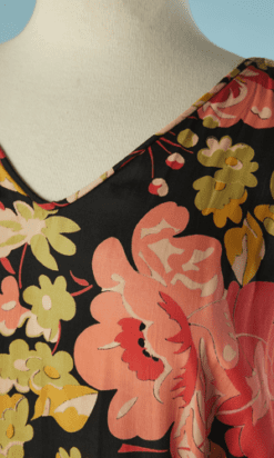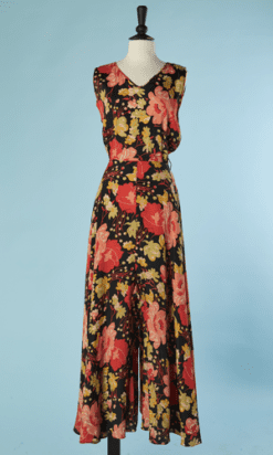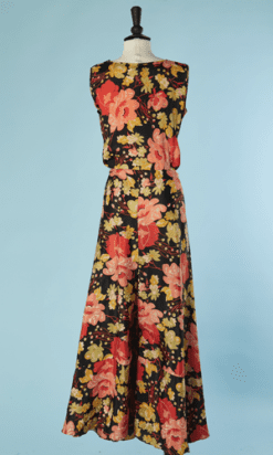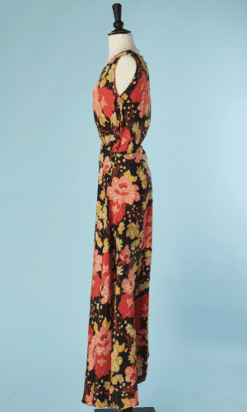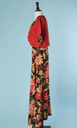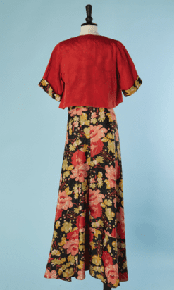Combinaison pantalon 1930 Stern Brothers Paris New York, en rayonne avec boléro assorti, en rayonne noire imprimée de grandes fleurs roses et rouges et petites fleurs vertes et jaunes, sans manches, taille cintrée, pattes d’éléphant