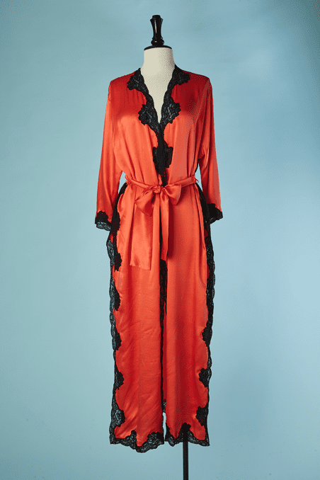 Déshabillé Sabbia Rosa en satin de soie orange et incrustation de dentelle noire sur les pourtours, manches longues, échancrures sur les côtés, ceinture assortie, étiquette blanche et verte