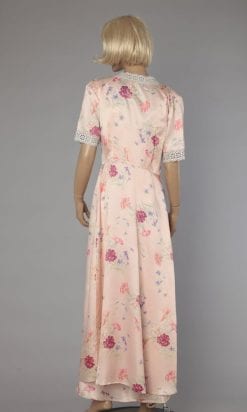 Ensemble 1940, chemise de nuit et déshabillé en satin rose imprimé de bouquets de fleurs.