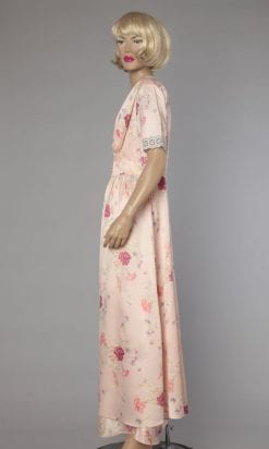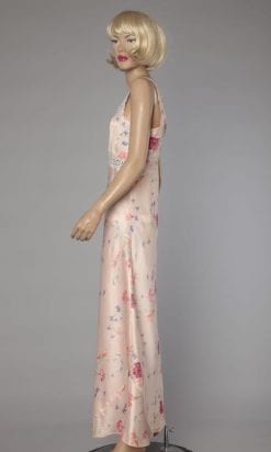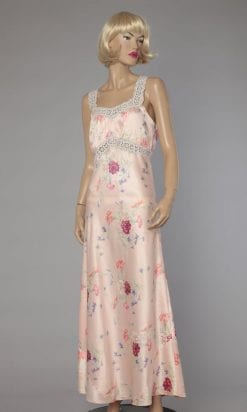 Étiquettes : 1940, Broderie anglaise, Chevilles, Imprimé de bouquets de fleurs, Imprimé de fleurs, Rose, Satin