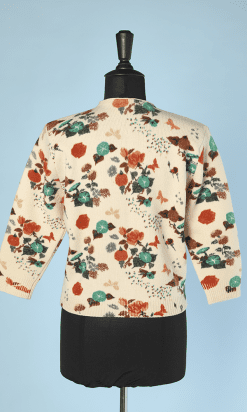 Gilet 1950 en lainage écru imprimé de roses et feuillages