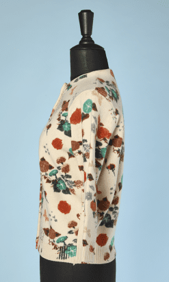 Gilet 1950 en lainage écru imprimé de roses et feuillages dans les tonalités de orange marron et vert.