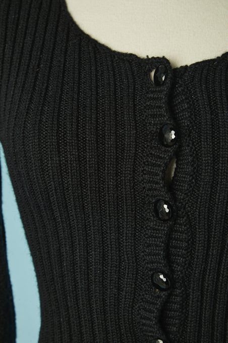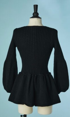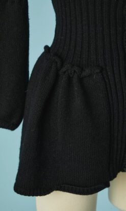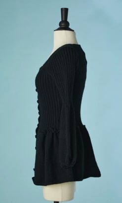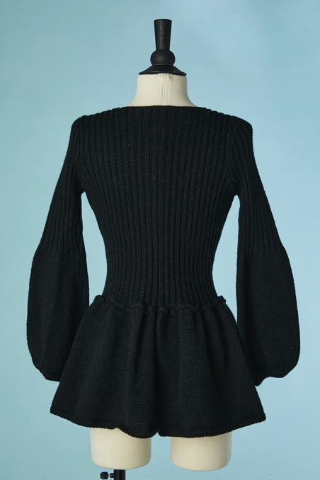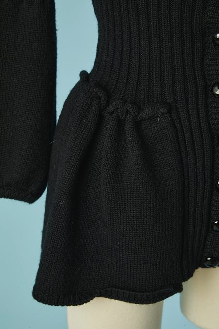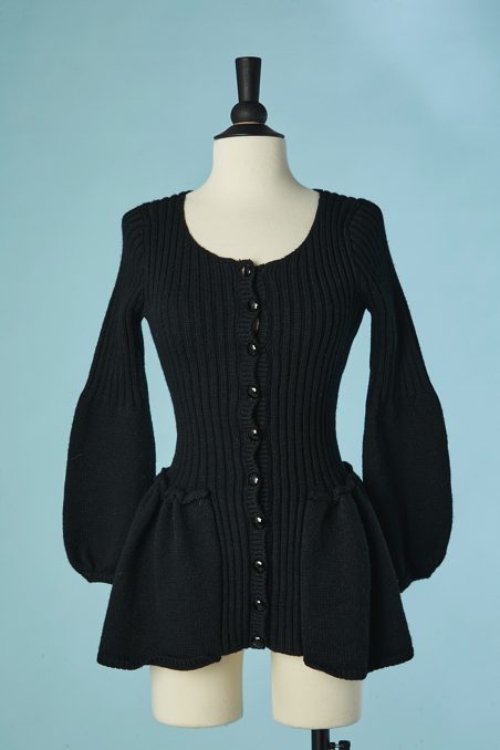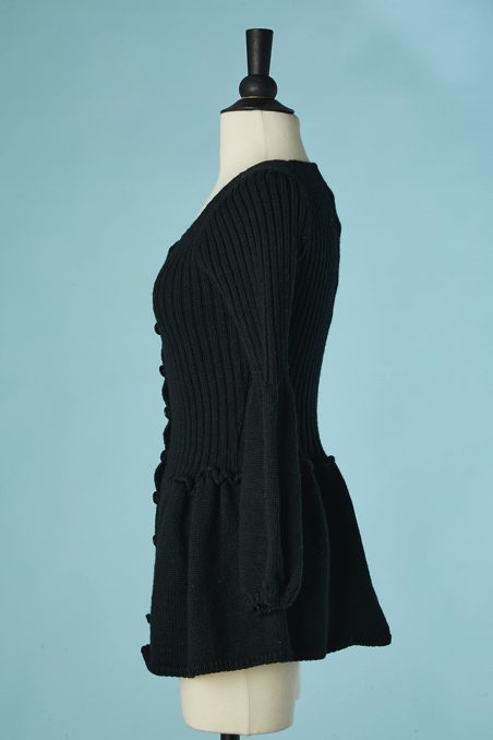 Gilet en laine noire tricoté avec maille côtelée, manches longues étroites évasées sous les coudes, encolure ronde, taille cintrée, basque froncée cousue sous la taille, boutons noirs