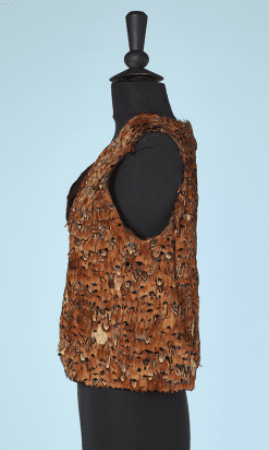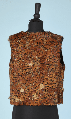 Gilet 1970 en plumes de coq dans les tonalités de marron, petites touches de noir et blanc, sans manches