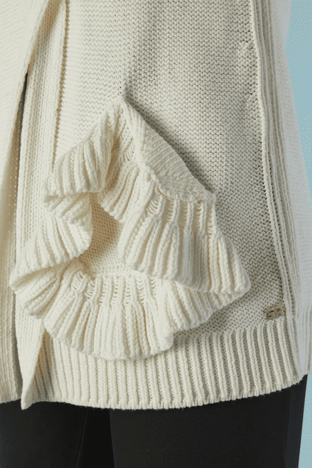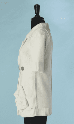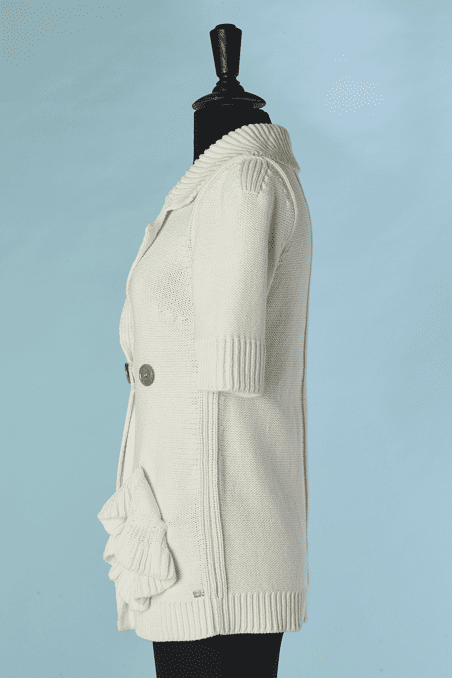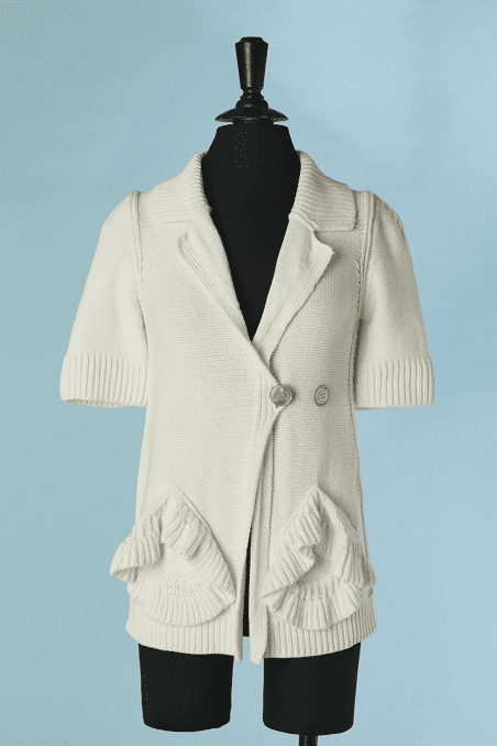 Gilet Sonia Rykiel en coton blanc, manches courtes, col cranté, double boutons brandés Sonia Rykiel, poches rondes avec volants, bords côtes, étiquette blanche et noire