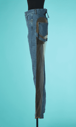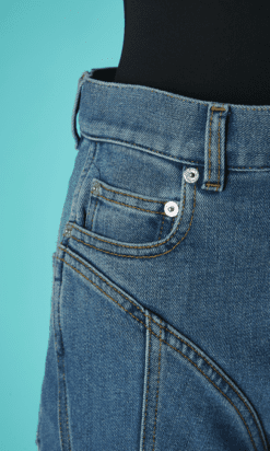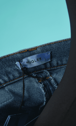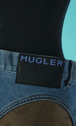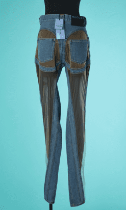 Étiquette : Jeans Mugler en denim bleu ciel et tulle nude