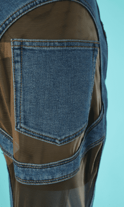 Jeans Mugler en denim bleu ciel et tulle nude aux fesses et sur les jambes, découpes en V devant, passants taille, poches devant et dos,