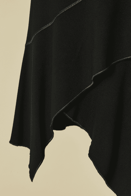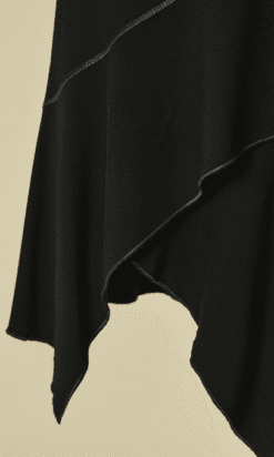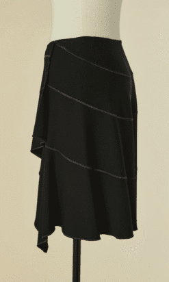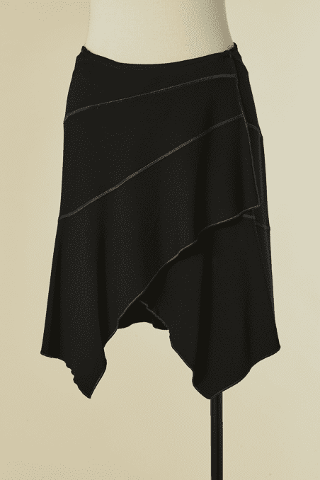 Jupe Alaïa asymétrique portefeuille en viscose noire avec surpiqûres grises, découpe en triangle devant et deux panneaux en pointe se ferme avec agrafe, étiquette beige et blanche Taille S