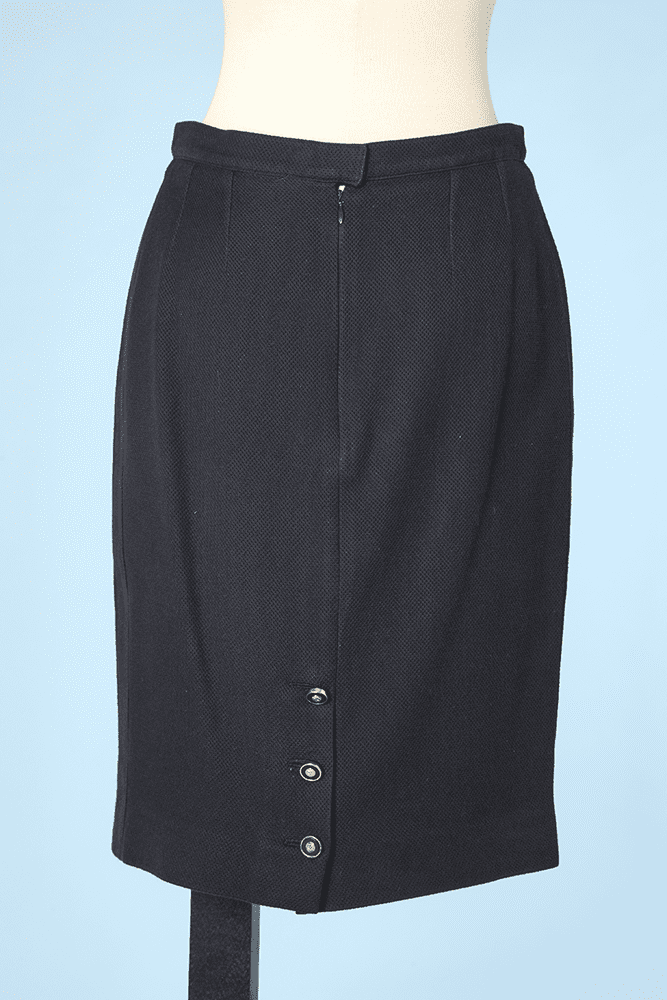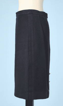 Jupe vintage en coton tissé bleu marine, série de boutons doré avec sigle Chanel au derrière de la jupe, griffée Chanel.