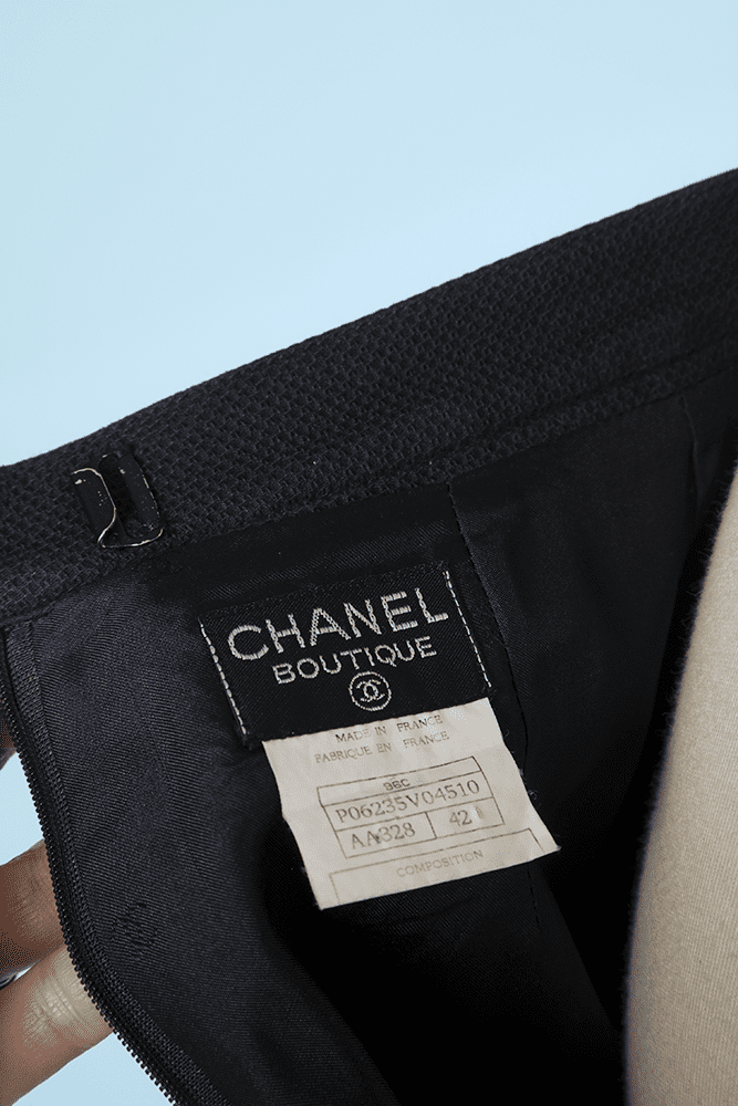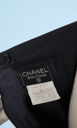 Étiquettes : Jupe en coton tissé, Jupe marine Chanel, Jupe vintage Chanel