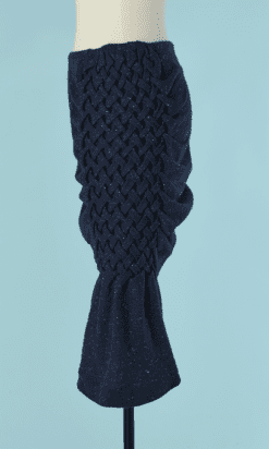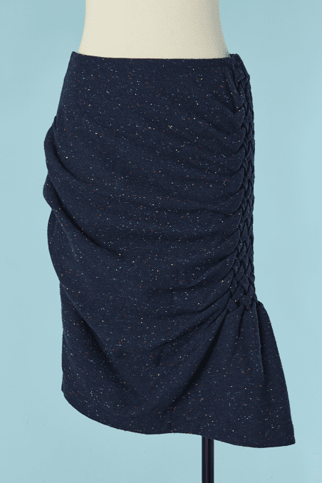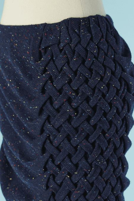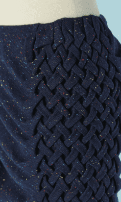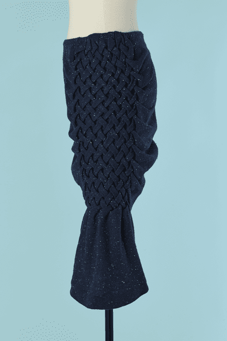 Jupe Jean Charles de Castelbajac en lainage bleu chiné avec large croisillon tressé sur le côté, quille plissée, fermeture éclair sur le côté, doublure jaune, étiquette blanche et noire