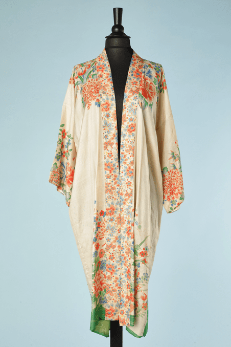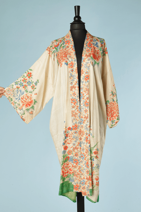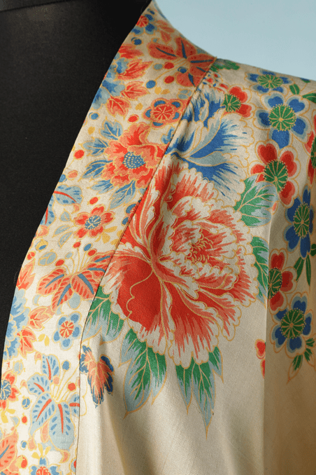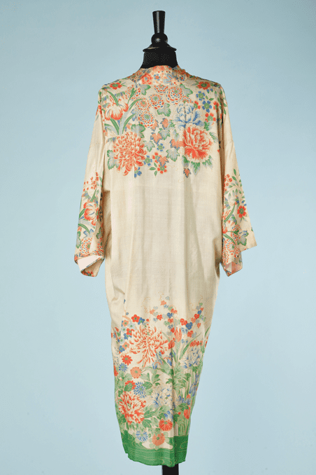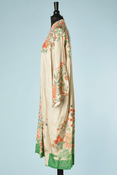Kimono 1930 en soie ivoire imprimé japonais de fleurs