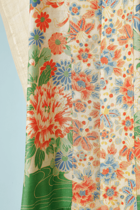 Étiquettes : Kimono 1930 en soie imprimé japonais, Kimono en soie imprimé japonais, Kimono en soie imprimé japonais de fleurs et feuillages, Kimono Japonnais, Soie
