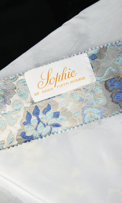 Longue robe du soir 1960 en satin de soie broché et lamé or à fines bretelles.