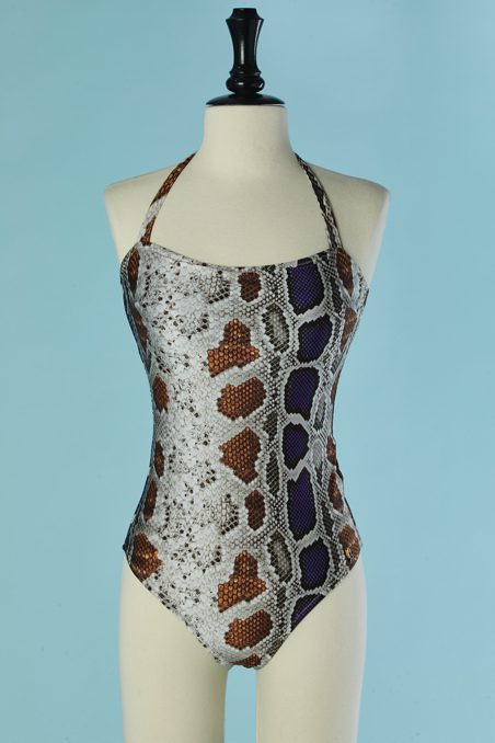 Maillot de bain 1 pièce Galliano imprimé serpent sur fond gris avec taches marron et violettes, bretelles nouées sur la nuque, doublure noire, neuf avec étiquette boutique et étiquette plastique marron et blanche