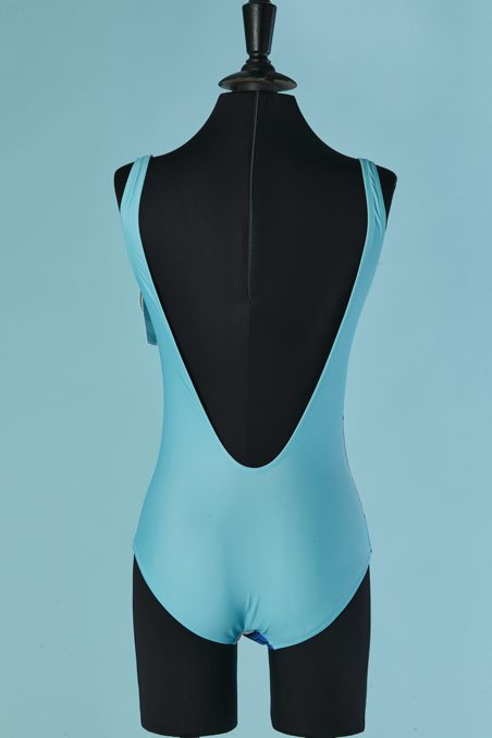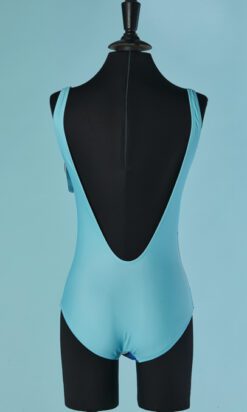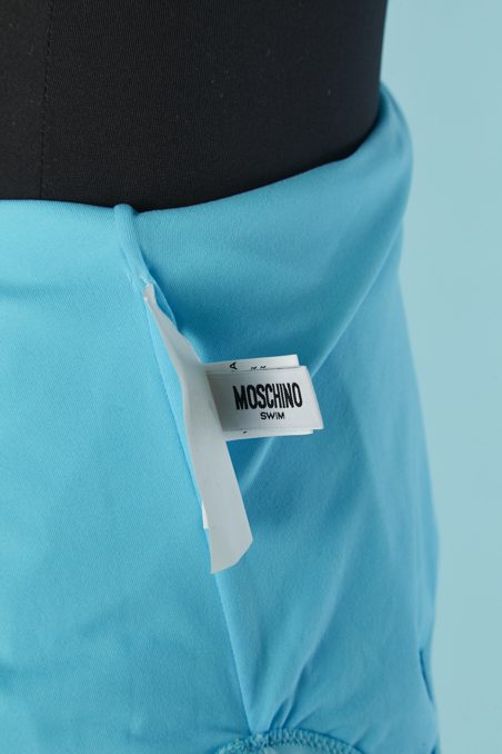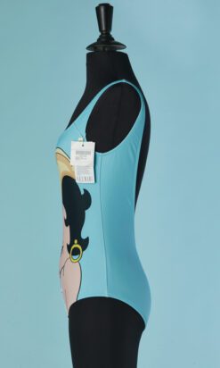 Maillot de bain 1 pièce Moschino en polyamide et lycra bleu ciel imprimé Betty Boop en maillot de bain avec chapeau de cow boy, bretelles, dos nu, étiquette blanche et noire