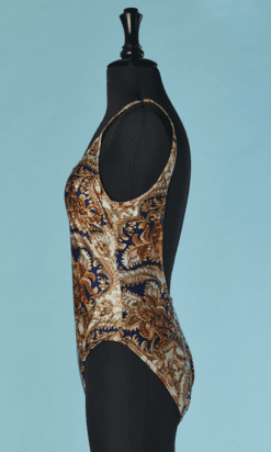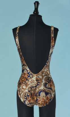 Maillot de bain Pierre Cardin 1 pièce circa 1970, en polyamide effet satin imprimé ameublement et surligné des traits or, soutien gorge incorporé, dos nu, échancré sur les cuisses, étiquette noire et blanche