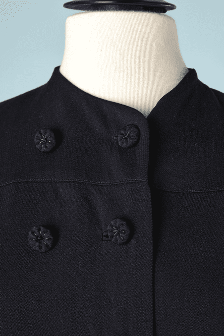 Manteau 1930 en lainage bleu marine, double larges manches plissées, double boutonnage de boutons en passementerie, taille cintrée
