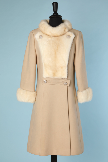 Manteau 1960 en jersey de laine beige, plastron col et poignets en vison écru, double boutonnage avec boutons incrustés de strass, martingale devant, taille cintrée
