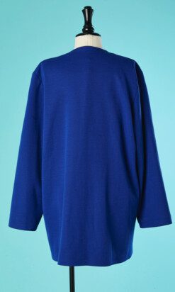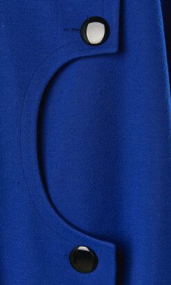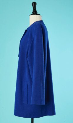 Manteau 3/4 Pierre Cardin vers 1980 en jersey de laine bleu électrique, manches longues, encolure ras de cou, boutonnage sur le côté avec découpe en arrondie au centre, doublure bleue
