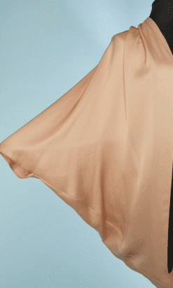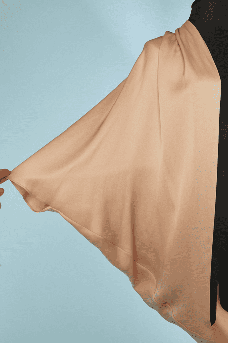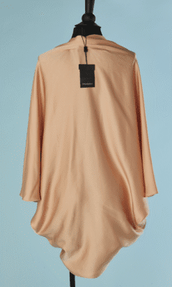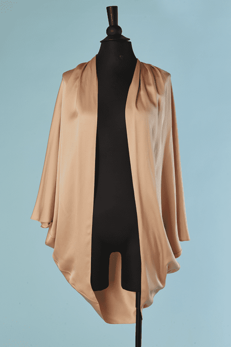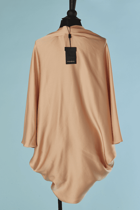 Manteau du soir Yves Saint Laurent « Edition du Soir » en satin de soie rose pêche, manches chauve souris, plissé aux épaules et en bas sur les côtés, porté ouvert, étiquette blanche et noire, neuf avec étiquette boutique