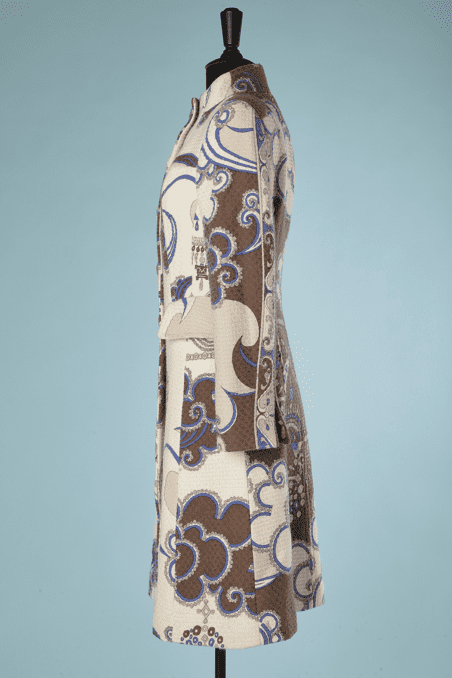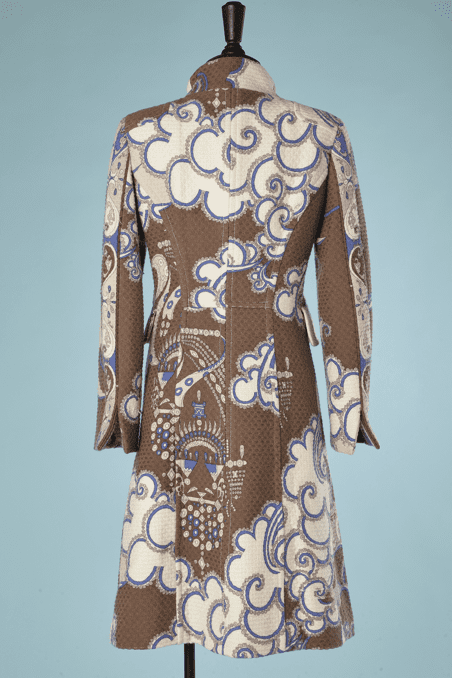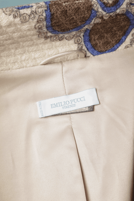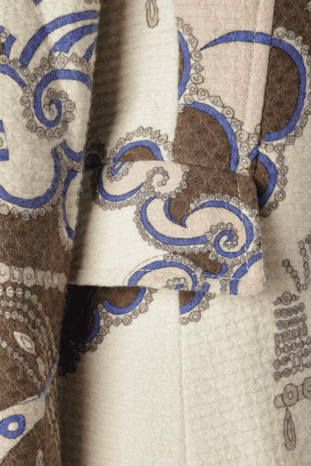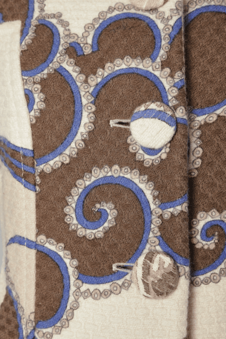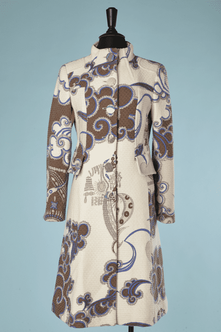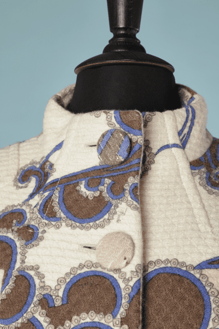 Manteau Emilio Pucci lainage et angora tissé nid d’abeille blanc et imprimé beige marron bleu, épaulettes, manches longues ouvertes au poignets, boutons recouverts, petit col montant
