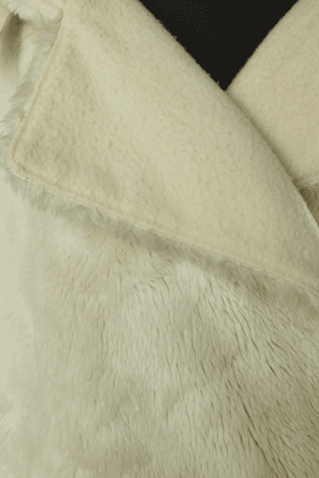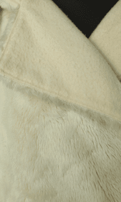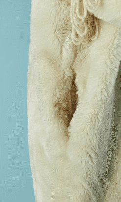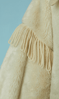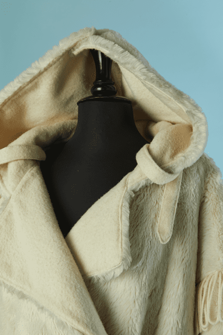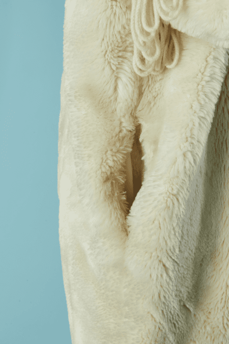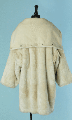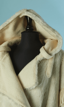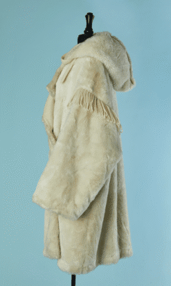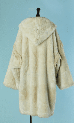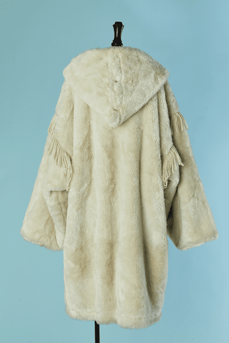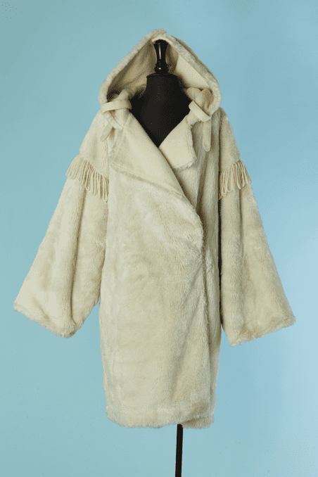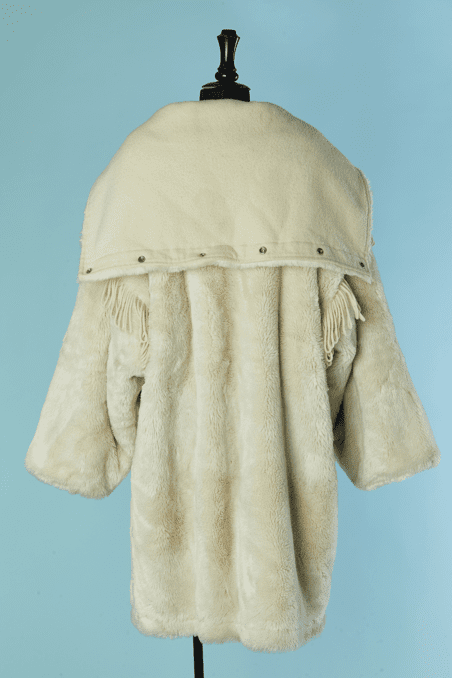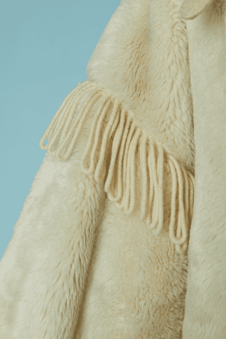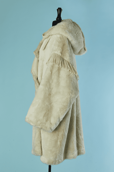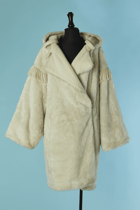 Manteau Jean Charles de Castelbajac Ko & Co vers 1980 en fausse fourrure écrue, coupe croisée, manches longues avec franges de laine, capuche avec pressions donnant un large col une fois ouvert, et pattes de chaque côtés du col,