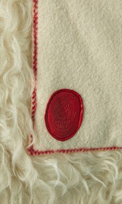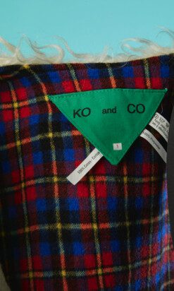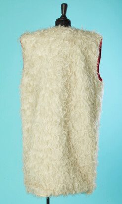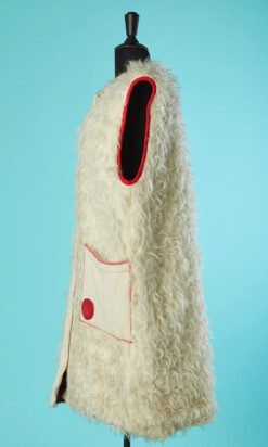 Manteau Jean Charles de Castelbajac Ko and Co en lainage écru et fausse fourrure circa 1970, liseré rouge et doublure écossaise, sans manches