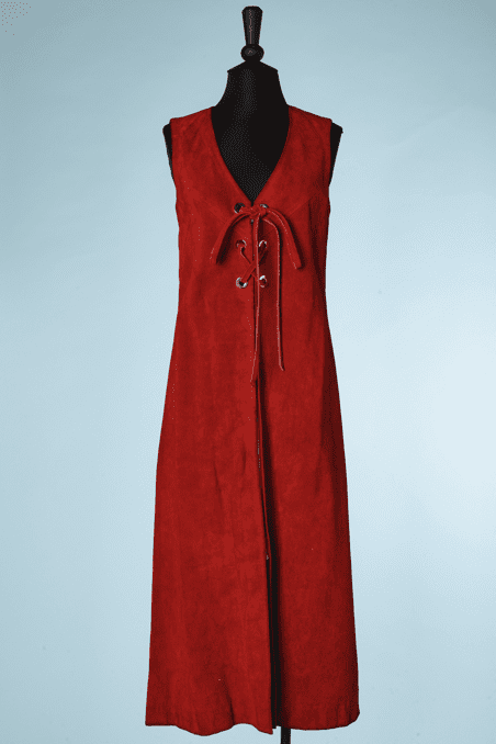 Long sleeveless coat 1970 in red suede, closes in front by a link passed on gold metal eyelets