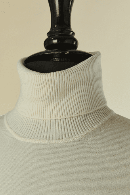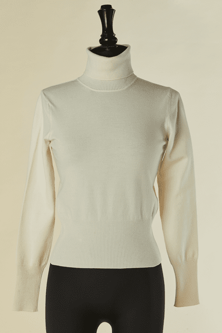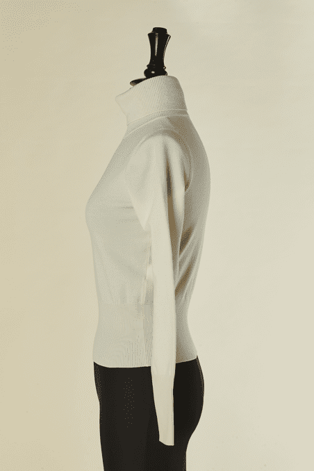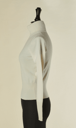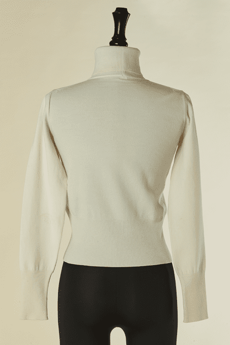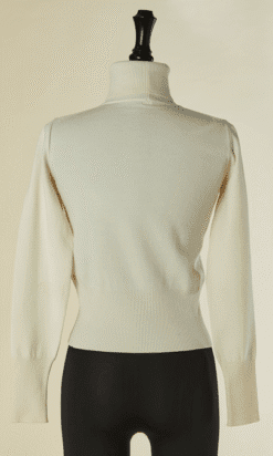 Pull Alaïa en laine et polyester blanc, manches longues, col cheminée, bords côtes au col, poignets et taille, Taille M indiquée mais correspond davantage à un 34-36, étiquette beige et blanche