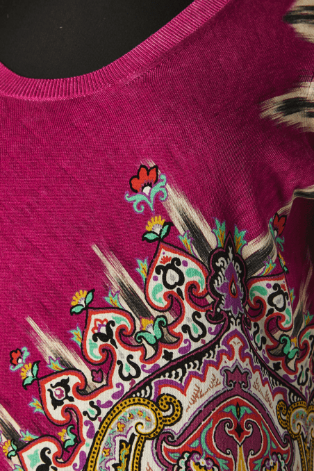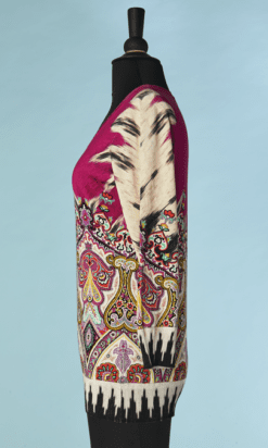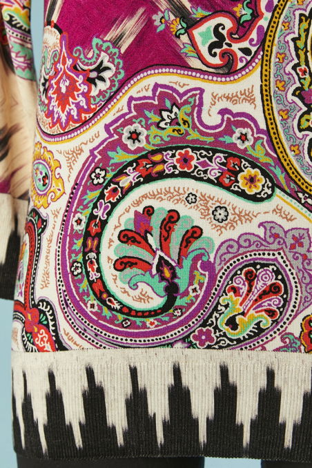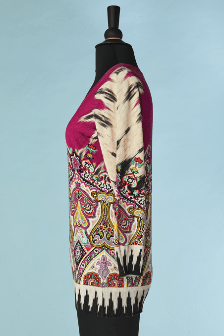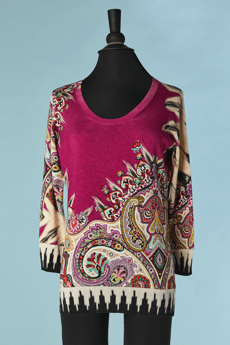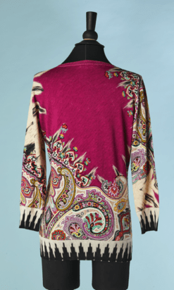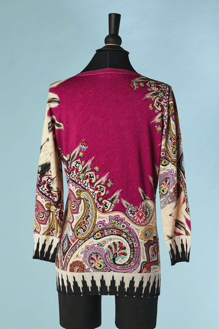 Pull Etro en coton et soie rose imprimé de motifs que l’ont retrouve sur les châles en cachemire du XIX ème siècle et qui sont réinterpréter dans les couleurs, manches longues, encolure arrondie.