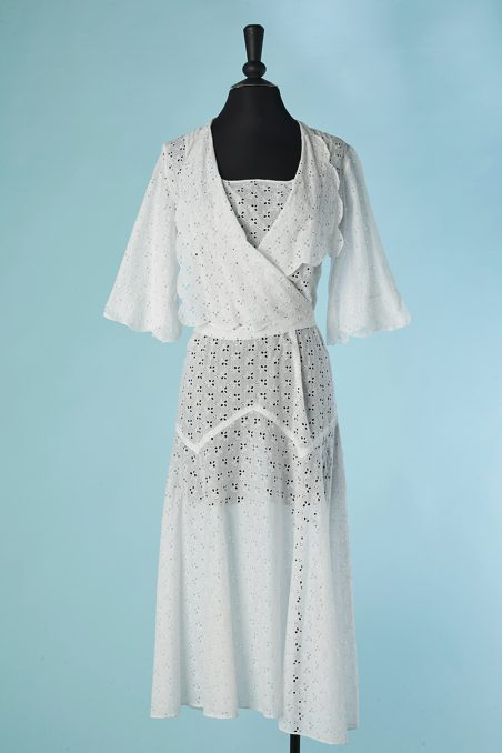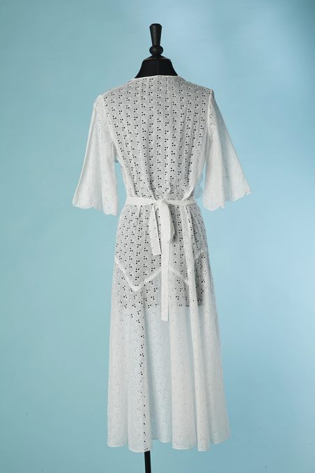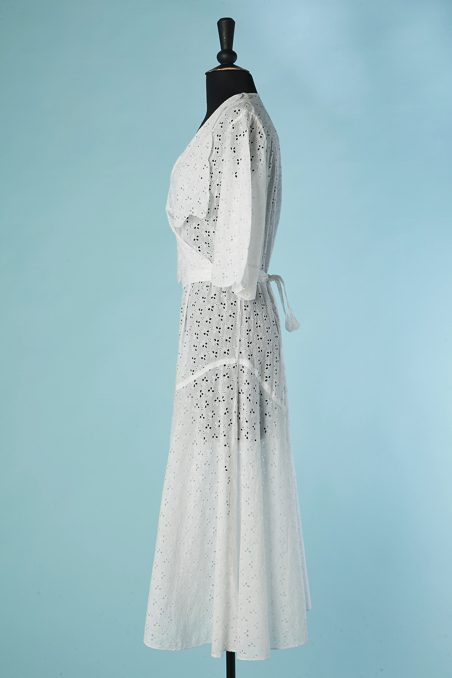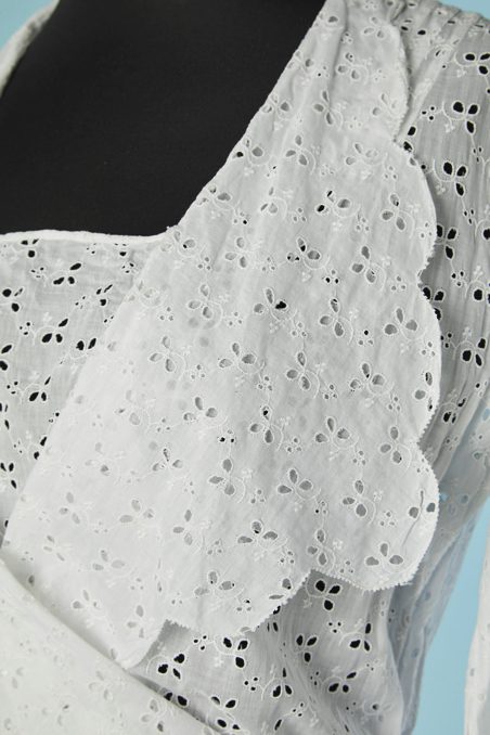 Robe 1925 en coton blanc et broderie anglaise, découpes en triangle sur les hanches, large col croisé en cache cœur fermé par une ceinture, festons autour du col, manches en ailes de papillons,