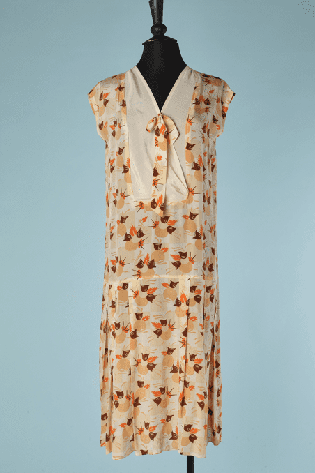 Robe 1925 de jour en soie ivoire imprimé de feuillages d’automne beige marron orange, encolure en V sur un plastron, petite cravate nouée, petites manches, taille basse et plis sur les côtés