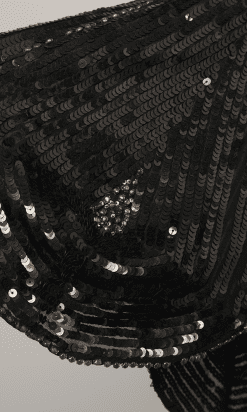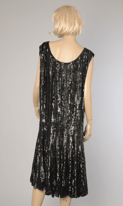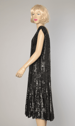 Étiquettes : 1925, Argent, Broderies de paillettes et perles, Charleston, Great Gatsby, Noir, Paillettes, Perles, Perles soufflées, Sous-genoux, Voile de coton