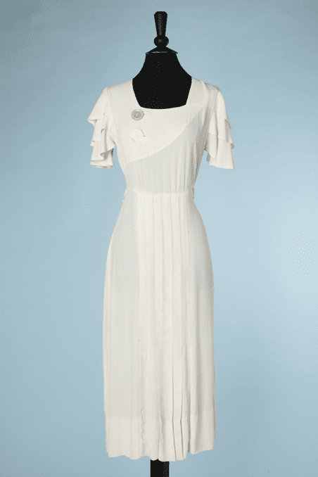 Dress 1930 in ivory silk pleated in front under the waist on a panel in the middle, two pleats in the back at 1/3 of the skirt, short sleeves with three ruffles, bias panel under the neckline trimmed with two large buttons on one side