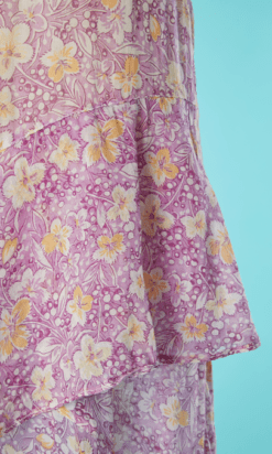 Étiquette : Robe 1930 en voile de coton blanc imprimé fleurs jaune et parme