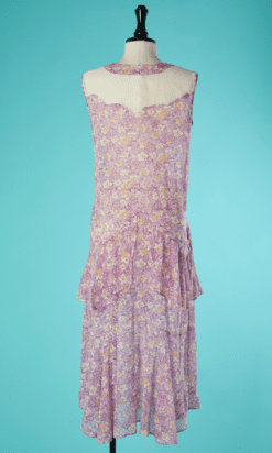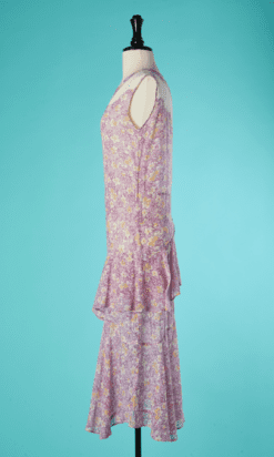 Robe 1930 en voile de coton blanc imprimé fleurs jaune et parme, taille basse avec large volant cousu, encolure en V avec incrustations de bandes blanches jaune et parme,