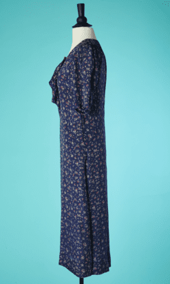Robe 1930 en rayonne marine imprimé de tous petits bouquets de fleurs, volants sur le haut du buste, petits boutons en verre rouge