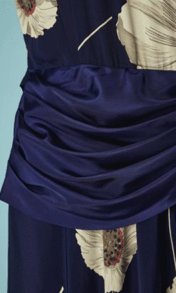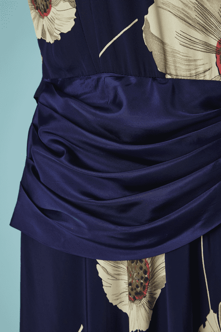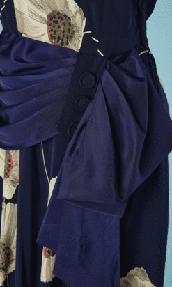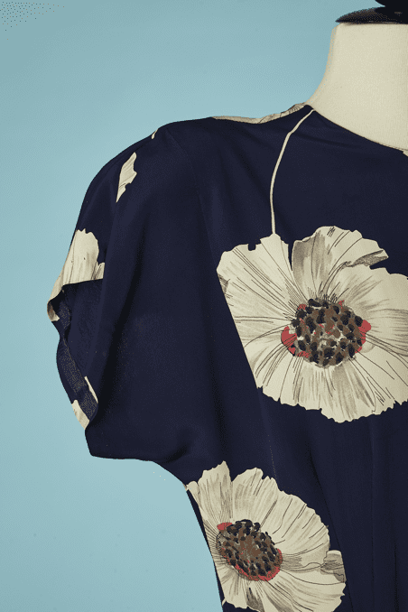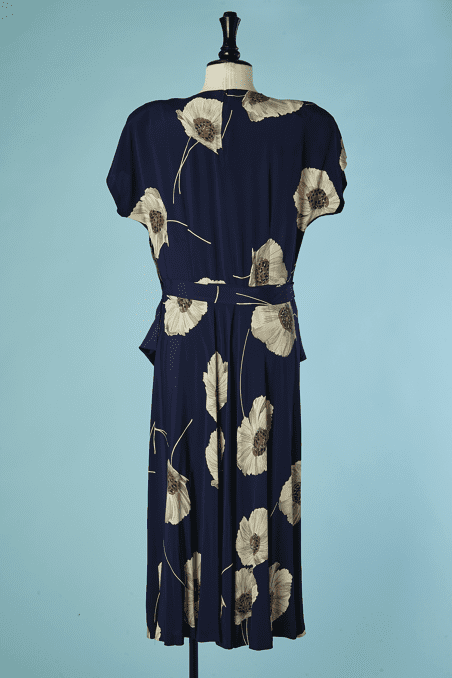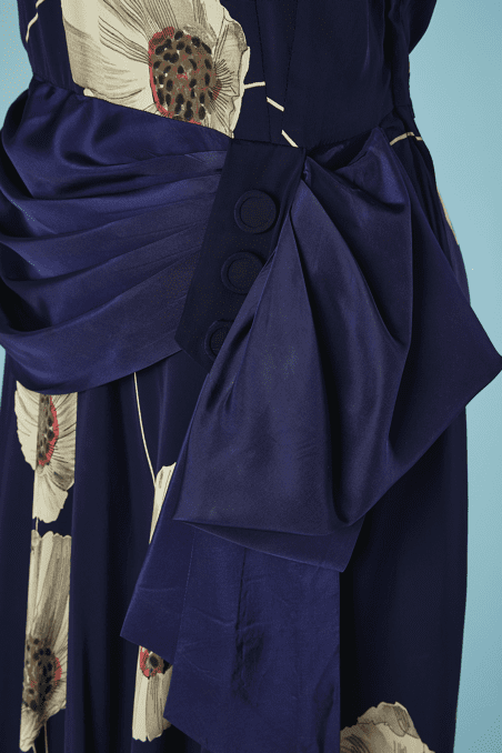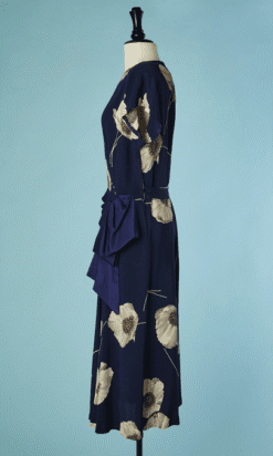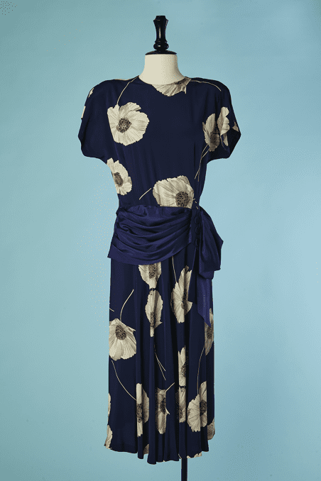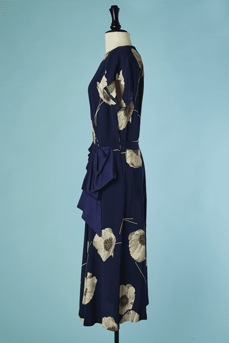 Robe 1940 en rayonne marine imprimée de pavots blanc grisé et touches de rouge, manches courtes épaulées, large ruban en faille marine drapé sur les hanches et forme un large nœud sur le côté, patte boutonnée sur un côté, encolure ras de cou,