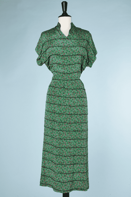 Robe 1940 en soie verte imprimée de fleurettes vertes roses et rouges et cousue de lignes de perles de verre vertes sur une sérié de plis horizontaux, manches courtes, encolure en v et col montant