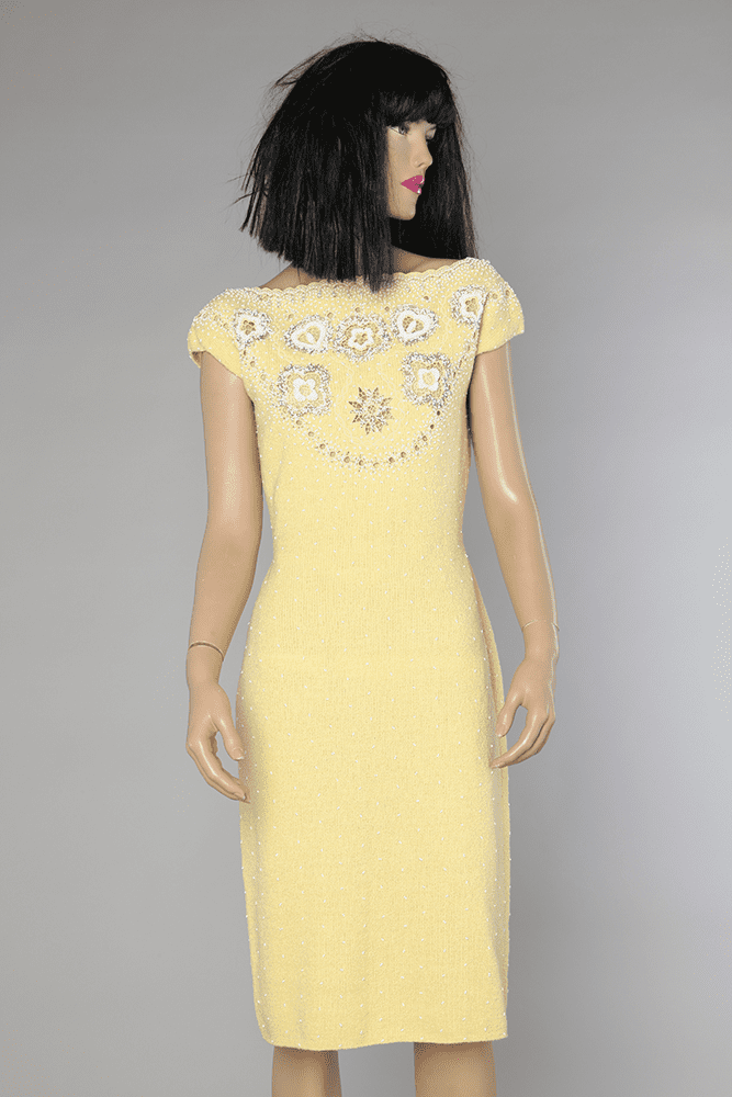 Robe 1960 en tricot jaune brodée de perles blanches et argentées en verre et brodée de motifs sur le devant.