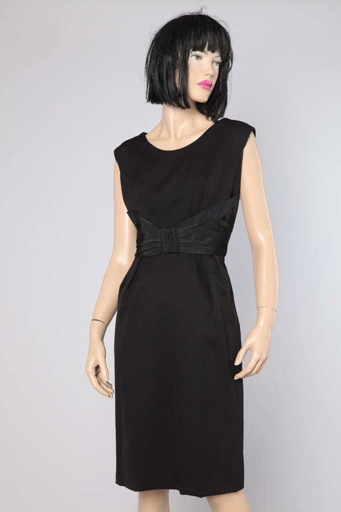 Robe 1960 en lainage noir avec ceinture et nœud en satin