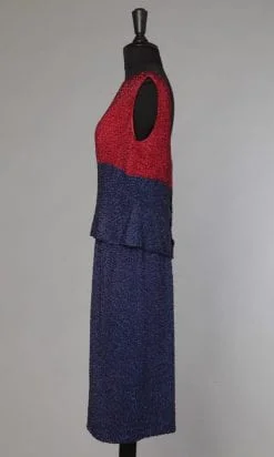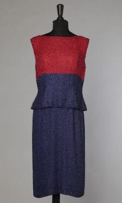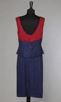 Étiquettes : 1960, Broderie vermicelle, Broderies de perles, Marine, Mi-mollet, Robe en deux parties, Rouge, Satin