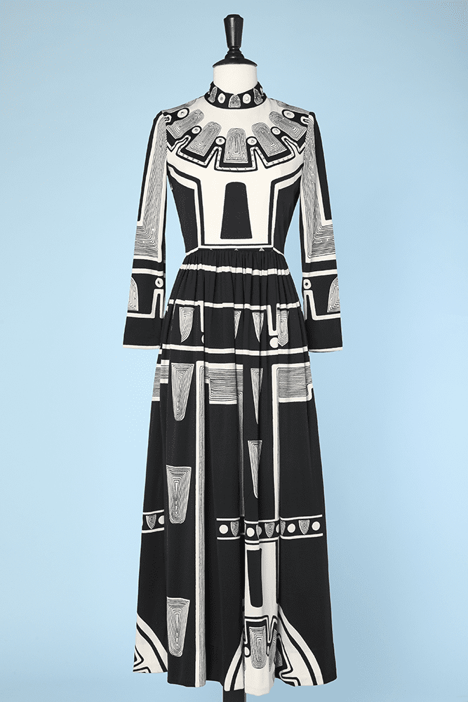 Robe 1970 en jersey bicolore noir et blanc, incrusté de petits et grands strass sur la partie haute de la robe, manches longues, petit col montant et fermeture éclair dos